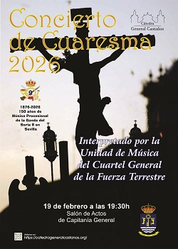 La Unidad de Música del Cuartel General de la Fuerza Terrestre interpretará una selección de las marchas más conocidas del repertorio cofrade y su Director, el Cte. Manuel Bernal Nieto nos explicará el devenir de la Música Militar y cofrade en Sevilla, desde ese lejano 1876 hasta nuestros días.